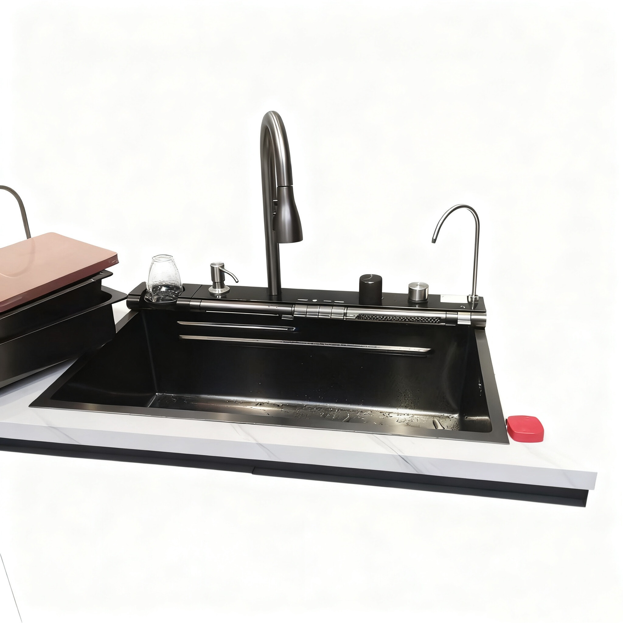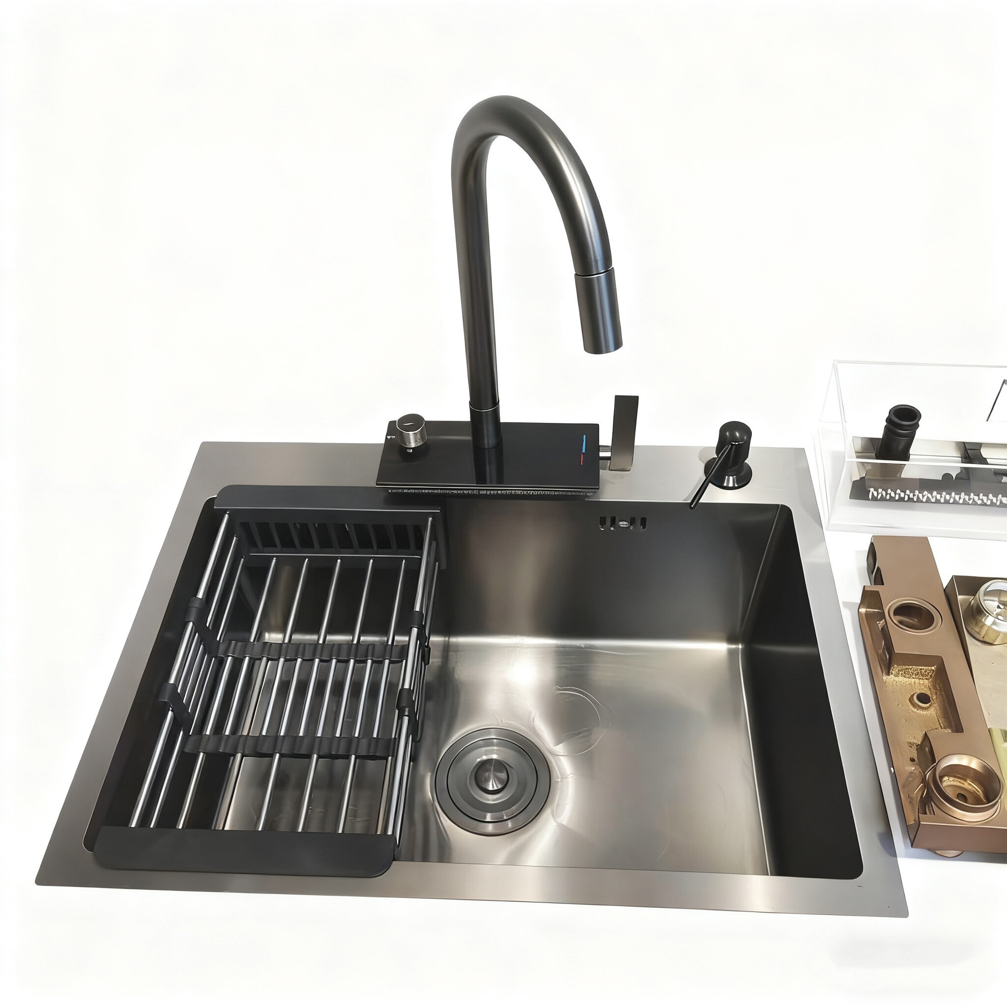 El diseño de arco alto no sólo añade un toque elegante a la decoración de la cocina, sino que también ofrece una funcionalidad superior.Permite llenar fácilmente contenedores altos y proporciona un espacio libre para maniobrar platos bajo el arroyo de aguaEl grifo está diseñado para un funcionamiento sin problemas, con un control preciso sobre el flujo de agua y la temperatura, mejorando la comodidad y eficiencia general de su experiencia de fregadero de cocina.Si usted es un chef profesional o un cocinero casero, este fregadero de acero inoxidable con grifo de arco alto combina practicidad y estética para satisfacer todas sus necesidades de cocina.